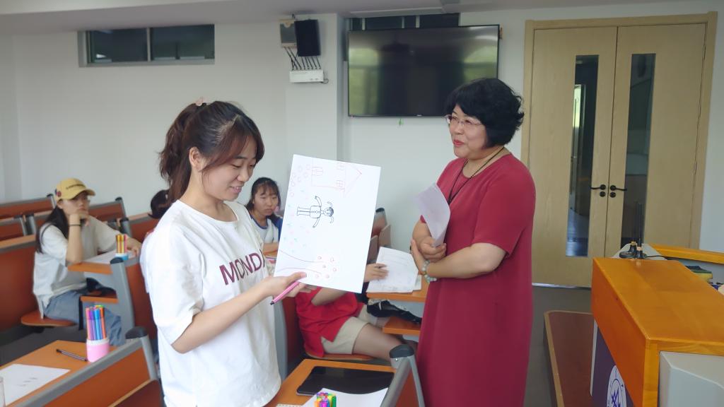 开课第一周,三位老师同时到场,课上课下与大学生展开了充分的交流和互动。马春霞老师承诺三位老师会用四周时间带领大家走进绘画展示的心理世界,如何通过一幅画观赏心灵世界的风景、解读心灵的密码。一场心灵之旅在马老师颇具画面感的美好语言描绘中启航。第一堂课,经验丰富的马春霞老师根据学生情况,采用了寓教于乐灵活多变的教学方法,通过解读每一位学生的“房树人”绘画,与学生充分互动,迅速打开了学生们的心扉,走进了学生们的心理世界,学生亲自体验到了心理绘画的神奇。