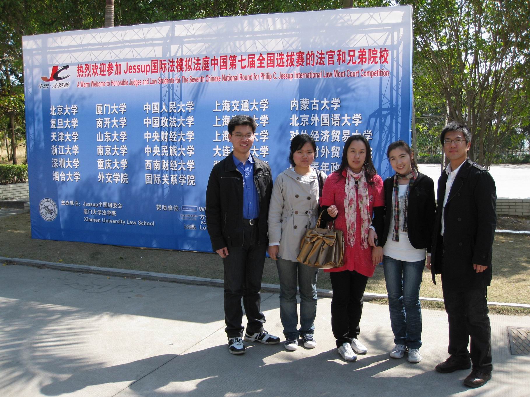 2009年2月18日至20日,厦门大学举办第七届“Philip C. Jessup国际法模拟法庭辩论赛”中国赛区选拔赛。为切实体会赛场氛围,进一步了解比赛规程,学习往届参赛队伍经验,在院领导支持下,由方芳老师带队,率领欧博孙滨、李金桥、李晓慧、蒋东东四名队员远赴厦门进行观摩,现场取经。