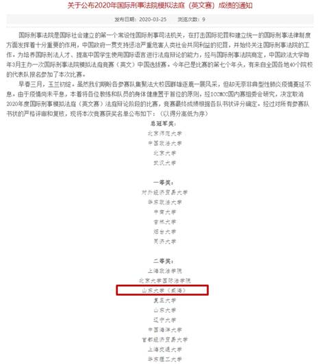 2020年3月25日,国际刑事法院模拟法庭(英文赛)组委会公布了2020年中国赛区获奖名单,欧博代表队表现出色,获2020年国际刑事法院模拟法庭大赛中国赛区二等奖。