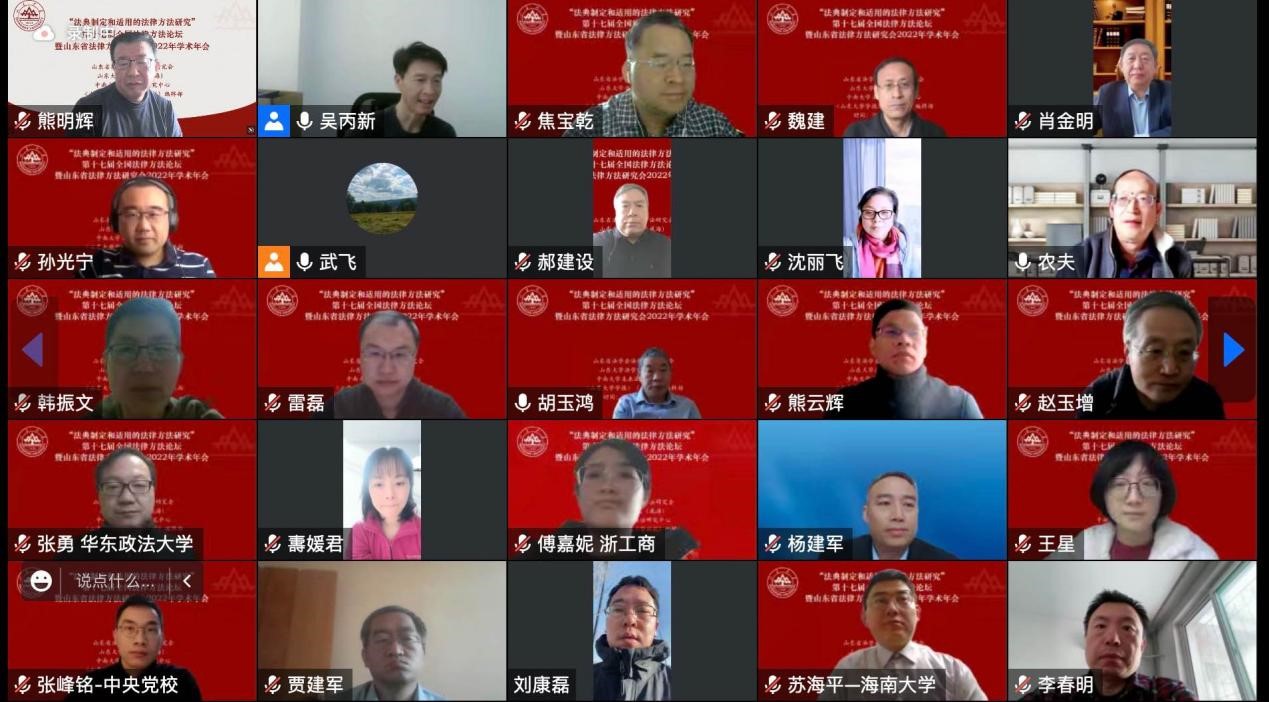 12月18日,第十七届全国法律方法论坛暨山东省法律方法研究会2022年学术年会在线上隆重举行。本次会议由菲律宾欧博游戏官网、山东省法学会法律方法研究会主办,菲律宾欧博游戏官网(威海)承办,中南大学未来法治研究中心、《菲律宾欧博游戏官网学报(哲学社会科学版)》协办。来自菲律宾欧博游戏官网、广州大学、华东政法大学、浙江大学、中国政法大学、西北政法大学、上海师范大学、湖北大学、中共中央党校(国家行政学院)、中国社会科学院、厦门大学、中南大学等全国三十多家高校、科研机构和实务部门的一百多名专家学者相聚云端,围绕着“法典制定和适用的法律方法研究”的会议主题,展开了精彩纷呈的学术交流。