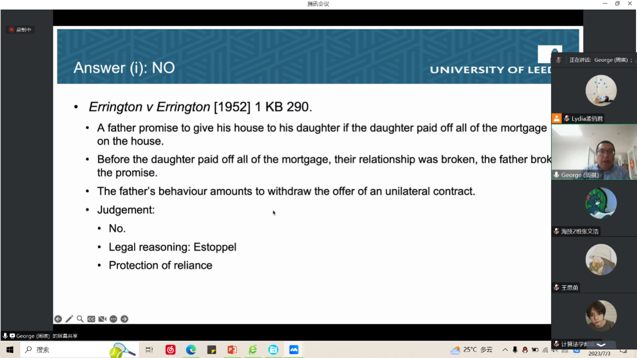 本课程由任职于英国利兹大学的周祺教授主讲,周祺教授亲切耐心,具有扎实的法学功底,拥有丰富的授课经验,在讲授了英国合同法相关知识的同时,提出问题,让同学们积极思考,对当堂知识点有更好的理解。同时为每个同学提出一个具体问题,让同学们在课堂上进行展示,并在展示后提供指导,指出优点和不足,这大大提高了同学们的英语能力和批判性思考能力,让同学们明确不足的同时,也提升了同学们的自信。本门课程开阔了同学们的国际视野,提高了在全球化背景下的学习能力,有利于同学们未来对涉外合同法的学习。