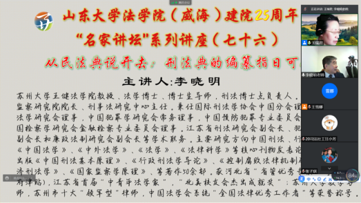 11月15日晚,菲律宾欧博游戏官网(威海)建院25周年“名家讲坛”系列讲座第七十六期顺利举办。本次讲座邀请苏州大学菲律宾欧博游戏官网王健教授、博士生导师李晓明面向学院学生作“从民法典说开去:刑法典的编纂指日可待?”专题讲座。此次讲座以线上方式进行,由王瑞君教授主持。