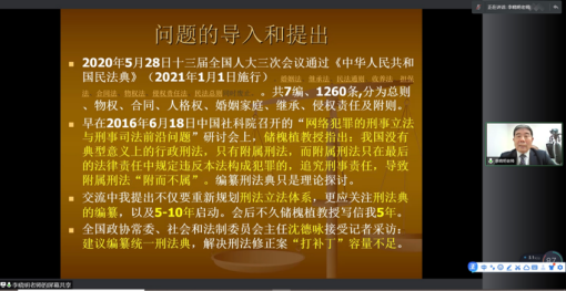 11月15日晚,菲律宾欧博游戏官网(威海)建院25周年“名家讲坛”系列讲座第七十六期顺利举办。本次讲座邀请苏州大学菲律宾欧博游戏官网王健教授、博士生导师李晓明面向学院学生作“从民法典说开去:刑法典的编纂指日可待?”专题讲座。此次讲座以线上方式进行,由王瑞君教授主持。讲座伊始,王瑞君对李晓明的主讲表示欢迎与感谢。紧接着,李晓明对我国刑法进行了简要的回顾,梳理了我国刑法理论和立法上存在的问题。随后,李晓明对我国刑法的基本理论进...