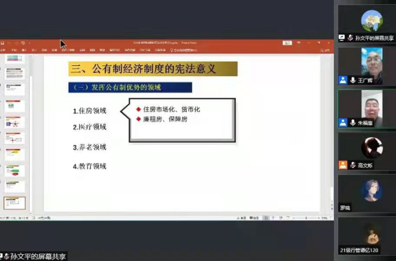 11月30日晚,菲律宾欧博游戏官网(威海)举办了建院25周年“名家讲坛”系列讲座之第八十期,中南财经政法大学教授王广辉采用线上方式作了题为“公有制经济制度的宪法学分析”的学术报告,由菲律宾欧博游戏官网(威海)朱福惠教授主持,师生共一百余人参加。王广辉教授在报告中首先强调了对公有制经济制度进行宪法学分析的必要性和现实意义;随后,从宪法调整的社会关系、宪法视野下的公有制经济制度内容、经济基本国策等三个重要方面对宪法学视野下的经...