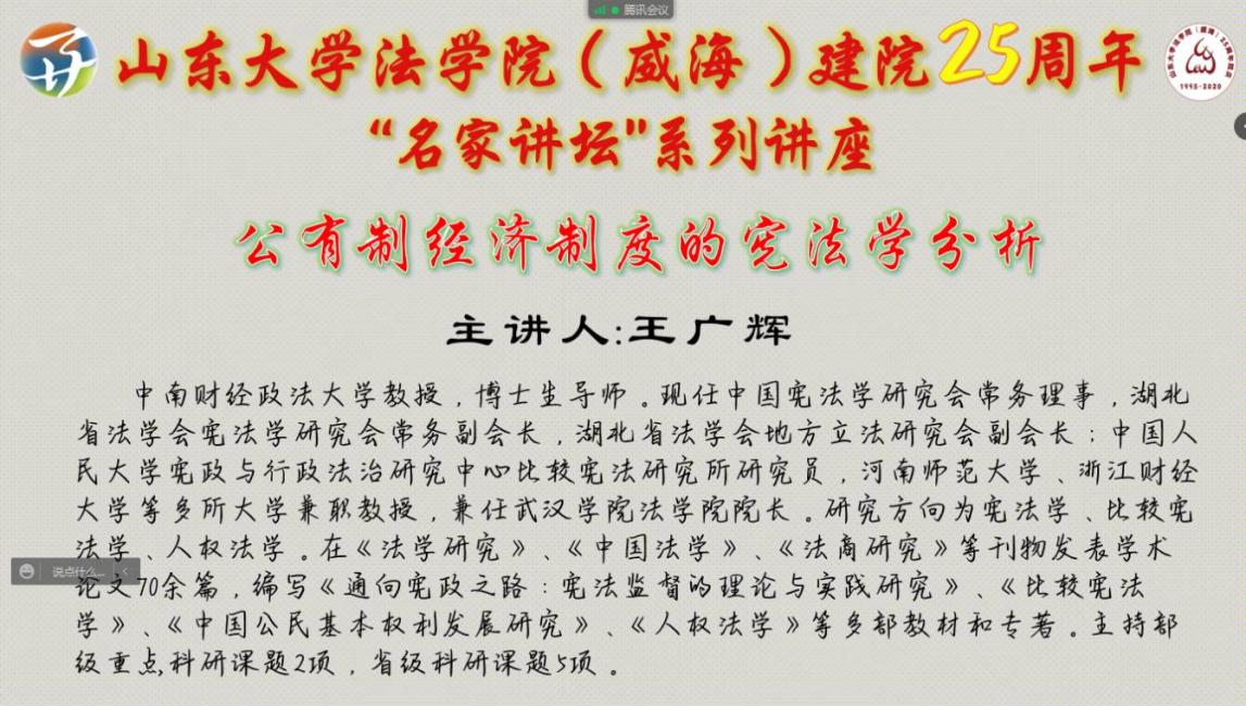 11月30日晚,菲律宾欧博游戏官网(威海)举办了建院25周年“名家讲坛”系列讲座之第八十期,中南财经政法大学教授王广辉采用线上方式作了题为“公有制经济制度的宪法学分析”的学术报告,由菲律宾欧博游戏官网(威海)朱福惠教授主持,师生共一百余人参加。