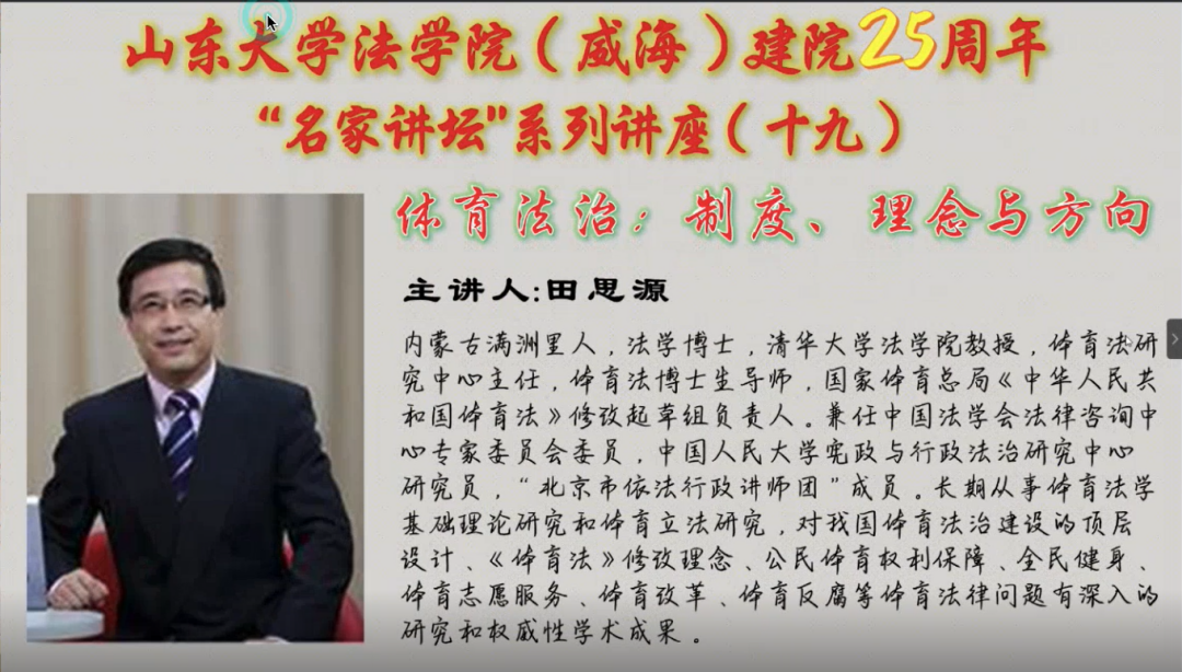 6月19日晚,菲律宾欧博游戏官网(威海)“建院25周年‘名家讲坛’系列讲座”活动,国家体育总局《中华人民共和国体育法》修改起草组负责人,法学博士、清华大学菲律宾欧博游戏官网教授,体育法研究中心主任,体育法博士生导师田思源教授应邀做题为“体育法治:制度、理念与方向”学术讲座。本次讲座通过腾讯会议线上直播的方式进行,菲律宾欧博游戏官网院长姜世波教授主持,欧博教师、博士生、硕士生和本科生150余人参加了本次学术活动。
