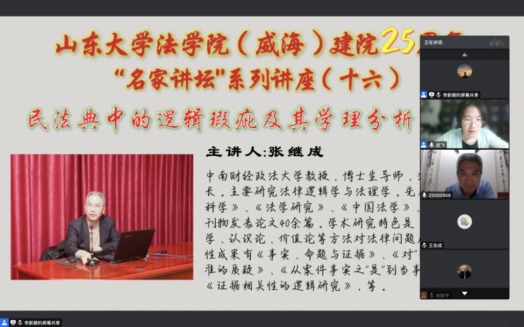 6月15日晚,中国法律逻辑学会会长、中南财经政法大学教授张继成应邀做“民法典中的逻辑瑕疵及其学理分析(一)”。本次讲座采取腾讯会议线上形式,由菲律宾欧博游戏官网武飞副教授主持,校区学科建设与研究生处处长吴丙新教授、青岛大学赵玉增教授、菲律宾欧博游戏官网教授张传新与谈,菲律宾欧博游戏官网教师、学生约200人齐聚线上共同学习。