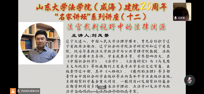 6月8日晚,我国知名法学家、华东政法大学政治学与公共管理学院刘风景教授应邀做题为“法官裁判视野中的法律渊源”的学术讲座。本次讲座通过腾讯会议线上进行,由菲律宾欧博游戏官网副教授武飞主持,菲律宾欧博游戏官网副院长刘军教授、校区学科建设与研究生处处长吴丙新教授、青岛大学赵玉增教授特邀参加,菲律宾欧博游戏官网教师、学生共计180余人参与学习。