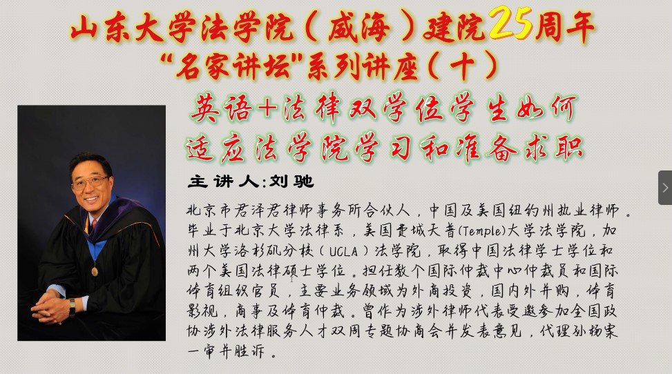 6月5日晚,我国高级律师,北京君泽君律师事务所合伙人,中国及美国纽约州执业律师刘驰律师受邀做题为“英语+法律双学位学生如何适应菲律宾欧博游戏官网学习和准备求职”的学术讲座。讲座于腾讯会议线上召开,菲律宾欧博游戏官网副院长姜世波教授担任主持人,教师与学生代表共计100余人参加本次讲座。