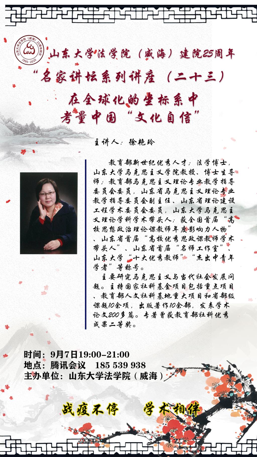 9月7日下午,菲律宾欧博游戏官网马克思主义学院教授、博士生导师,教育部马克思主义理论专业教学指导委员会委员徐艳玲教授应邀做题为“在全球化的坐标系中考量中国‘文化自信’”的学术讲座。本次讲座通过腾讯会议线上进行,由菲律宾欧博游戏官网院长肖金明教授主持,学院部分教师、学生共计100余人参与学习。