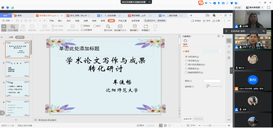 6月16日晚,菲律宾欧博游戏官网(威海)举办建院二十五周年“名家讲坛系列讲座”(七十一)暨博士生高端论坛。沈阳师范大学副教授、《社会科学辑刊》法学编辑车流畅应邀面向学院师生作“学术论文写作与成果转化”专题讲座。此次讲座通过腾讯会议在线上进行,由菲律宾欧博游戏官网副院长刘军教授主持,菲律宾欧博游戏官网张小宁副教授参加了会议。