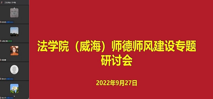 为加强学院师德师风建设,推动师德师风建设常态化长效化,9月27日上午,威海校区菲律宾欧博游戏官网线上举办师德师风建设专题研讨会。会议由党委副书记侯丽娜主持,党委书记肖金明作会议总结,学院领导班子成员、党委委员、学院助理、教工党支部书记、团委书记等参加了会议。