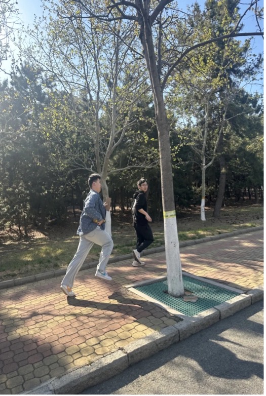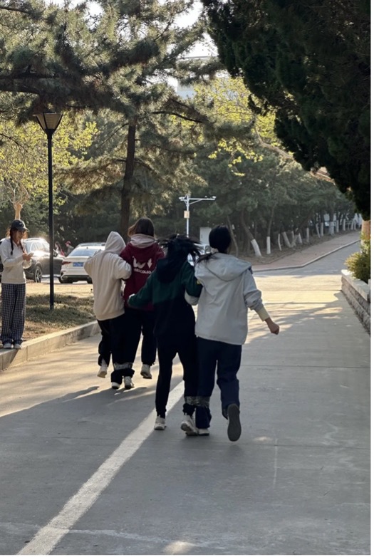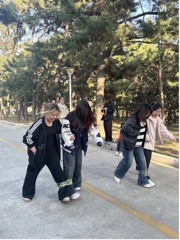 追逐赛闭幕后,同学们在文学楼附近区域集合,分组开展两人三足赛跑。四人一组构成七支队伍,每队参赛的两人用胶带将各自的一条腿捆绑在一起,两两配对进行对决。各组同学八仙过海各显神通,有的通过喊口号来保证两人步伐一致,有的将捆住的两只脚抬起通过跳跃的方式完赛,有的过于激动而在中途摔倒,憾失冠军……赛跑过程中惊喜不断,欢笑不断,最终第一组同学以6.65秒的成绩豪取第一名称号。