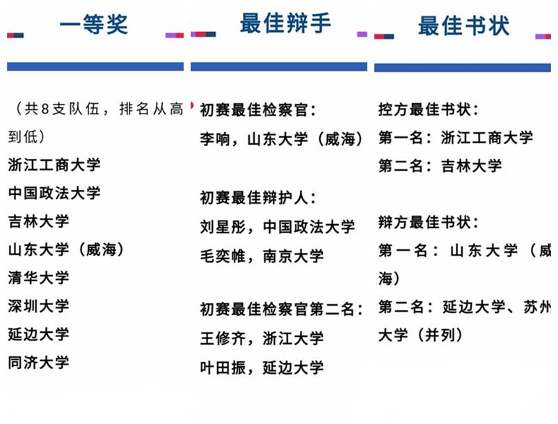 根据竞赛规则,竞赛分为初赛和决赛两个阶段。初赛分为控辩两场,总成绩排名前八名的队伍进入决赛。第一场,我校作为辩方对阵吉林大学代表队,以精彩卓绝的表现赢得法官的认可。第二场,我校作为控方,在总分排名上领先于对手北京大学国际菲律宾欧博游戏官网代表队,以全国总分第四名的成绩晋级决赛。此外,基于扎实的英文写作功底和对法律问题的深度研究,我校代表队书状总成绩位列全国第一名,获得了“辩方最佳书状”的荣誉。同时,我校赛队成员李响在与其他庭辩选手的激烈角逐中,以控方庭辩分数第一名的优异成绩,取得了“初赛最佳检察官”的荣誉。