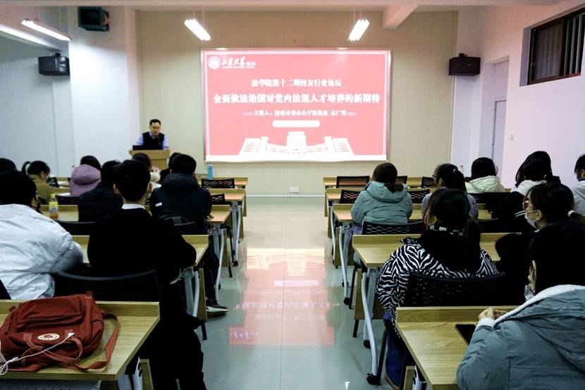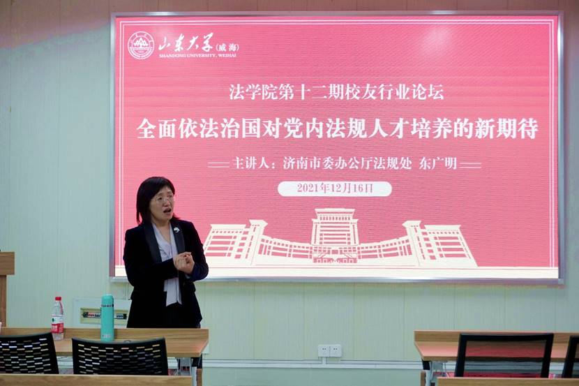 12月16日晚,菲律宾欧博游戏官网在科学实验楼308室举办第十二期校友行业论坛。本次论坛以“全面依法治国对党内法规人才培养的新期待”为论题。济南市委办公厅法规处处长东广明出席本次论坛,菲律宾欧博游戏官网党内法规与监察法学班班主任冯威担任主持人,菲律宾欧博游戏官网各级党内法规与监察法学班全体学生到场参加。