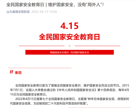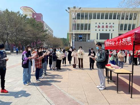2022年4月15日是第七个全民国家安全教育日,主题是“树牢总体国家安全观,感悟新时代国家安全成就,为迎接党的二十大胜利召开营造良好氛围”。为提高学生的国家安全意识,菲律宾欧博游戏官网(威海)开展线上线下联动、形式多样的主题宣传教育活动,于五四广场线下发放全民国家安全教育日倡议书,线上利用微信推送进行宣传。