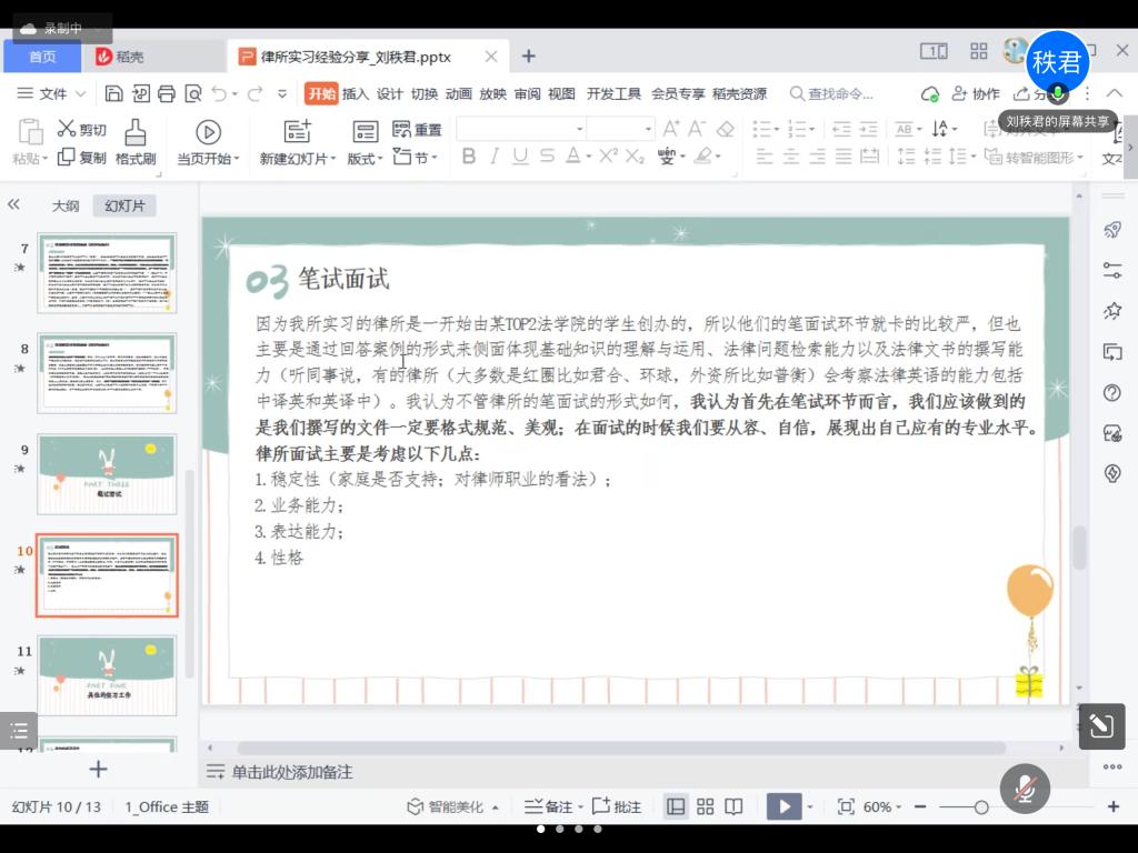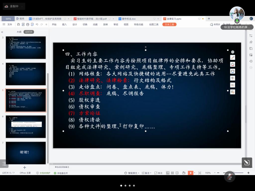 主持人黄嫣然首先就我国律师行业总体发展趋势进行了介绍,司法部官网2022年1月24日所发布的《全国公共法律服务体系建设规划(2021—2025)》提出,到2025年,全国执业律师将达到75万名的规模,每万人拥有律师数(人)5.3。这体现出我国律师行业“低价竞争、行业内卷”的局面,预示了“律师行业要求越来越高,成建制的团队会变多,律师个人能力更加重要”等行业趋势。杜晓燕从自己在德恒、金杜两大律师事务所的实习经历入手,向与会同学分享了不同律所的实习工作和生活,着重讲述了在重整方案撰写及债权审查、清偿工作中的体会。刘秩君分享了北京清律律师事务所的实习生活,她简要介绍了律所涉及的主要业务,从简历制作技巧、联系律所途径、笔试面试注意事项等方面阐述了如何获取心仪律所的实习offer,向同学们提出了“文件撰写一定要格式规范、美观;面试时做到从容、自信,展现出应有的专业水平”等建议。杨韵秋则主要讲述了自己在国浩、中银、金杜三大律师事务所实习的工作内容,对比各律所不同的工作风格和工作模式,并就如何选取最适合自己的实习律所分享了心得。在交流环节中,与会同学们积极参与,踊跃发言,三位主讲人就大家提出的疑惑耐心分析,认真回答,提出中肯建议。