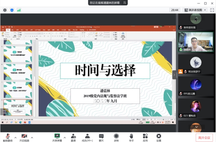 潘震林以“时间与选择”为主题,主要与大家分享了如何平衡学习、学生工作、社会实践、生活之间的关系。他希望新生们敢于尝试,在面对选择时重视个人兴趣,勤于反思,更好的认识自我。省文萱向新生们具体讲解了国家奖学金申请经验。她从学业、科研竞赛、志愿活动等方面进行分享,特别强调了英语学习的重要性,同时也总结了申请国家奖学金的技巧等。邹忻容首先向新生们进行介绍国家奖学金,详细点出了申报国家奖学金的重点,以及个人心得。她希望新生们可以积极参加活动,对自己要有自信心。最后,她希望在场新生们都能充实自己的大学生涯。