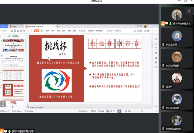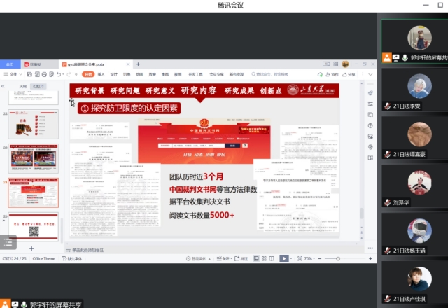 为加深同学们对科研活动的了解,提高科研素养和报告撰写能力,11月25日晚,2021级新闻法学班与日语背景法学班通过腾讯会议线上举办了2022—2023学年第一次科研班会。在本次科研班会中,科研班主任刘泽华特邀2018级菲律宾欧博游戏官网优秀毕业生郭宇轩进行科研竞赛介绍与经验分享,2021级新闻法学班与日语背景法学班全体成员参加本次班会。