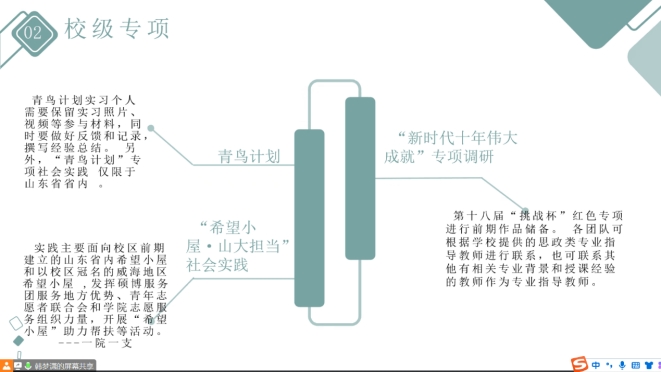 本次科研班会充分考虑了学生多层次、多元化的社会实践活动开展情况,帮助学生总结了寒假社会实践活动的经验成果,有助于学生加深对社会实践活动的认识,为学生进一步开展社会实践活动打下了坚实基础。