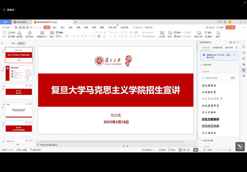 马文亮首先介绍了复旦马克思主义学院的基本情况。他指出,复旦马克思主义学院重视对现实的关照,科研成果丰硕,毕业生就业前景广阔。在保研经验方面,马文亮介绍了夏令营的流程与准备并对相关问题进行答疑。他强调,要重视申请材料与面试的准备,保持良好心态,自信面对。即使是“保研边缘人”,也应积极尝试申请夏令营,学生可以通过夏令营获得更多机会,开阔眼界,结识优秀同学。马文亮还邀请了2019级优秀保研生潘震林详细介绍保研经验。潘震林建议学生慎重选择院校以及专业,用端正的态度准备考核材料;关于考核的准备,潘震林表示应当提前阅读相关著作并重视英语的学习。在最后的交流提问环节,马文亮与潘震林热心回答学生提出的问题,对学生报考复旦大学马克思主义学院表示欢迎。