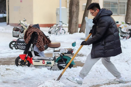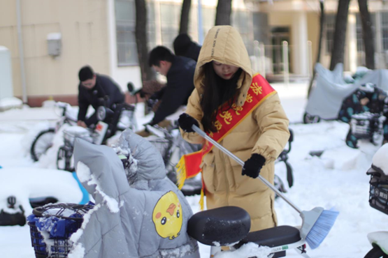 此次活动的顺利开展,离不开志愿者们的辛勤付出。下午三点,志愿者们在学生公寓8号楼前集合并领取铁锹、扫帚、清雪铲等工具,随后便开始了井然有序的清扫工作。在活动现场,志愿者们分成两组,一组负责清理电动车积雪,另一组负责清理道路积雪、坚冰。经过近一个小时的努力,电动车上的积雪得到了有效的清理,并在学生公寓8号楼前开辟出了一条“安全通道”,保障了同学们的财产安全和出行安全。