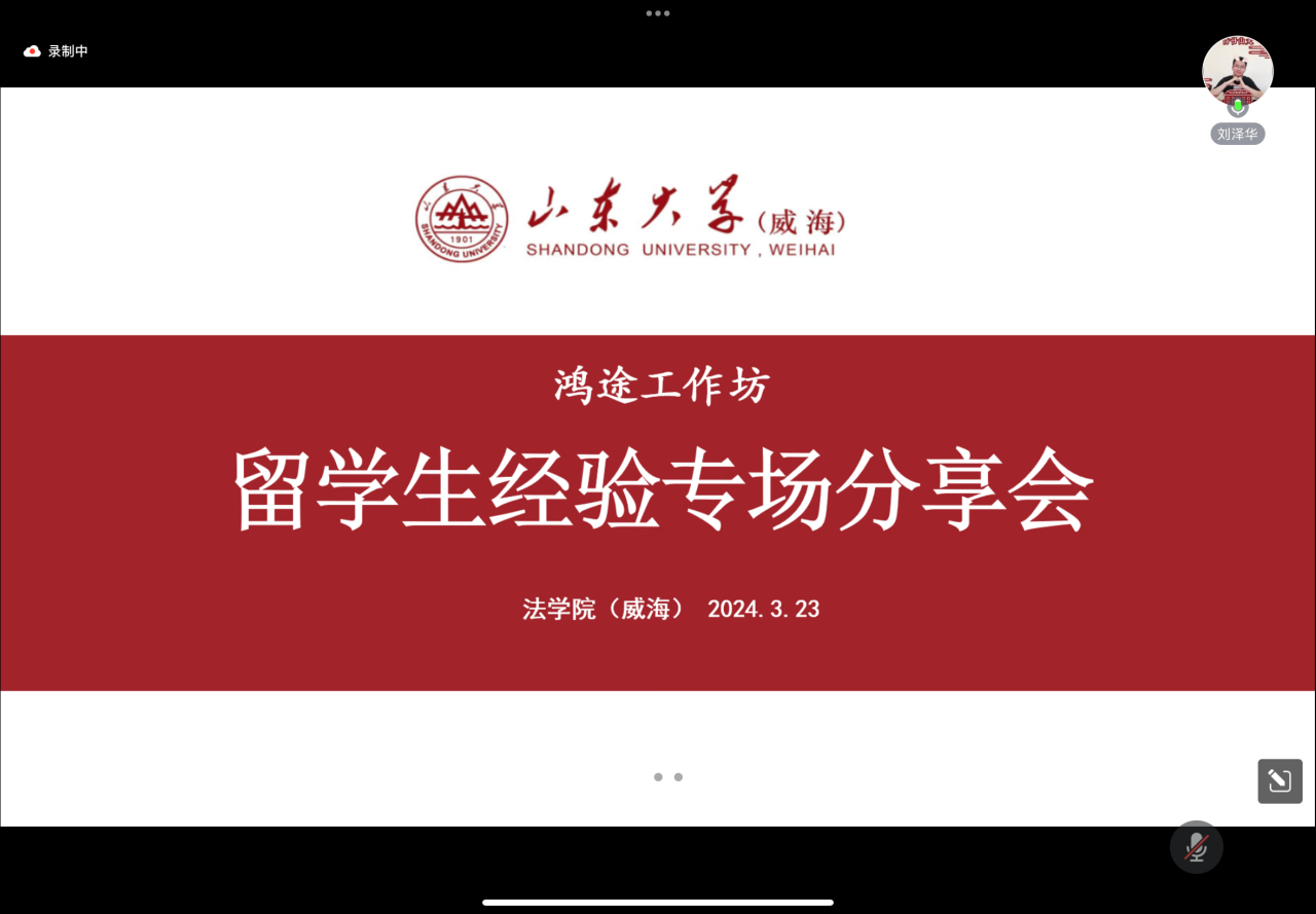 为帮助本科生了解出国留学的相关事宜,加深本科生对留学的认识,菲律宾欧博游戏官网(威海)于3月23日举办鸿途工作坊——留学生经验专场分享会,学院辅导员刘泽华出席本次分享会,新加坡国立大学硕士杨韵秋,澳门大学研究生、香港浸会大学博士生梁铠杰,乔治城大学法律中心硕士谢雨轩作为嘉宾分享留学经验,于嘉欣担任主持,学院有意留学的本科生参与本次分享会。