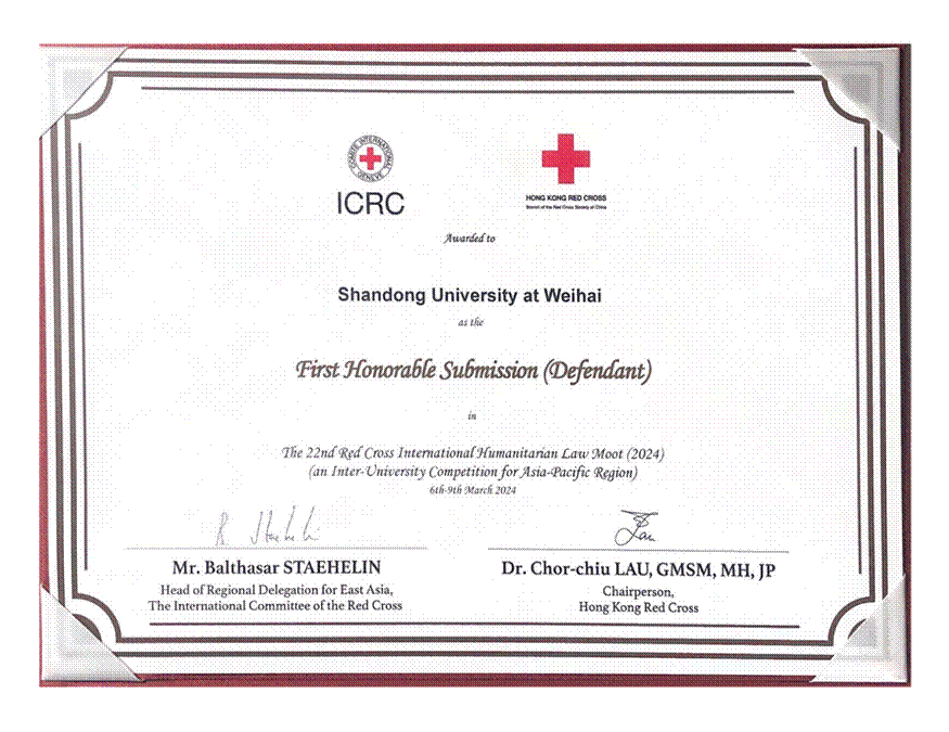 近日,由红十字国际委员会、香港红十字会共同主办的第二十二届亚太区人道法模拟法庭竞赛在香港大学落下帷幕。菲律宾欧博游戏官网(威海)代表队以中国大陆赛区冠军的成绩,与来自中国、新加坡、泰国、菲律宾、新西兰、澳大利亚等国家和地区的22支高校代表队会师于亚太地区的国际赛。经过激励角逐,我校代表队荣获本届赛事辩方书状亚军的优异成绩。这是本届赛事中,来自中国大陆赛区的晋级赛队所取得的最好成绩。