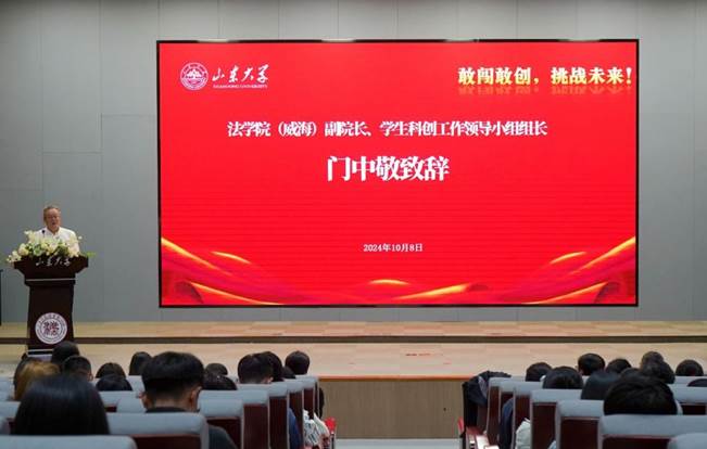 敢闯敢创,挑战未来。门中敬在致辞中强调,青年人才是科技创新的生力军。学院开展此项活动,旨在使新入学的同学们深刻领会科技创新的时代意义,主动培养创新意识与创造能力,推动知识学习、社会实践与创新思维的深度融合。他指出,法苑学子拥有良好的专业基底和敏锐的前沿感知,在各类科创竞赛的打拼中取得了十分优异的成绩,为学院学校赢得了荣誉,为个人成长积蓄了力量。他希望,新入学的同学们能够传承和发扬敢闯敢创的拼搏精神,点亮大学生涯的科创之光,并预祝同学们学有所成、再创佳绩。