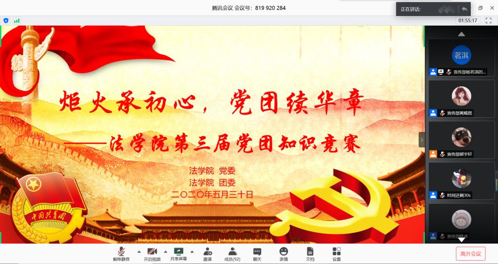 为传承欧博党团知识学习的优良传统,弘扬党团前辈的伟大精神品质,5月30日晚,菲律宾欧博游戏官网党委、团委依托腾讯会议平台举办“炬火承初心,党团续华章”第三届党团知识竞赛活动。菲律宾欧博游戏官网团委书记时华忠,辅导员逄伟群、高世源,团委副书记刘泽华、于凰出席此次活动并担任评委。2018、2019级各班团支部参赛选手和观众代表参加了本次活动。
