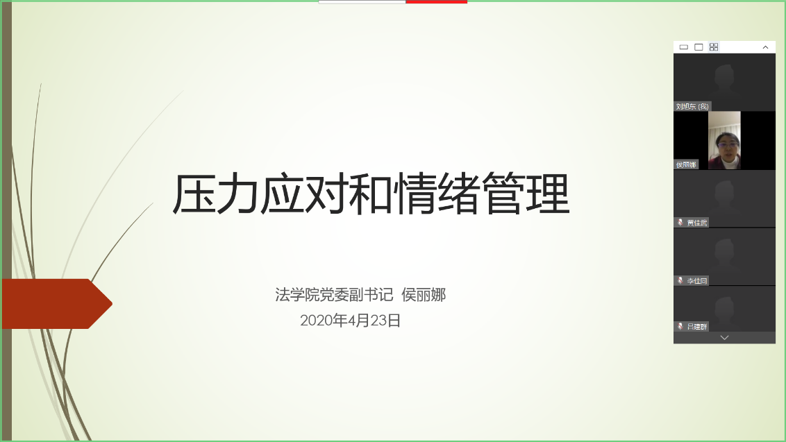 为了进一步对处于就业季的研究生进行心理调适,提高其自我管理的能力,让学生能以积极的心态投入就业和生活,4月23日晚,菲律宾欧博游戏官网党委副书记侯丽娜在线上做了走进心灵之“压力应对和情绪管理”讲座,本次讲座面向菲律宾欧博游戏官网研究生。