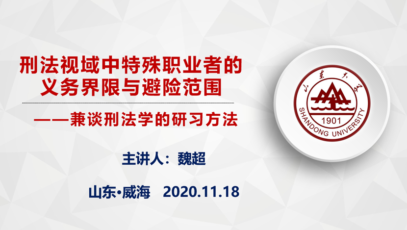 11月18日晚,菲律宾欧博游戏官网“知行工作室”以腾讯会议线上讲座的形式,成功举办了第一期“知行学术论坛”。苏州大学王健菲律宾欧博游戏官网讲师、德国马克斯-普朗克外国刑法与国际刑法研究所访问学者魏超博士,受邀做了题为“刑法视域中特殊职业者的义务界限与避险范围——兼谈刑法学的研习方法”的学术报告。菲律宾欧博游戏官网“知行工作室”主持人、2020级博士研究生吴睿佳主持讲座,来自菲律宾欧博游戏官网的博士生、硕士生、本科生30余人听取了学术报告。