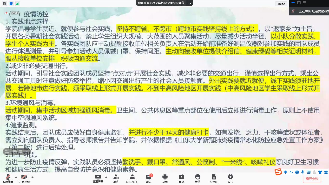 会议伊始,社会实践部工作人员宋倩文以疫情防控、出行安全等六大类安全问题为切入点向与会人员详细阐述安全保护措施。她强调,相关负责部门将通过“两制一案”模式加强对实践团队的安全监督。时华忠进行安全教育发言,他先就近三年学院社会实践所得荣誉向与会同学作简要介绍,并提出对学院暑期社会实践团队的新要求。时华忠指出,实践团队应提高安全意识,做好交通、财产、人身安全等方面的防范措施;应高度重视团队内部的组织性和纪律性;应努力开展有针对性、时效性、意义性的实践活动,避免开展以功利性为出发点、以形式主义为内容的实践活动;应落实实践宣传活动,扩大其影响力。侯丽娜在总结发言中提出两点期许。她指出,作为社会科学类学生,一是需要一以贯之的坚持“学以致用”理念,以知识指导实践,以实践完善知识;二是应以实践为契机,提高实践课题的转化率、传承率。最后,李维新从实践宣传和团队报销两个方面深入浅出地介绍了社会实践活动的部分流程和相关要求。