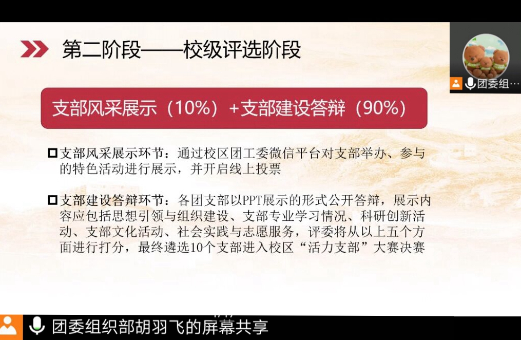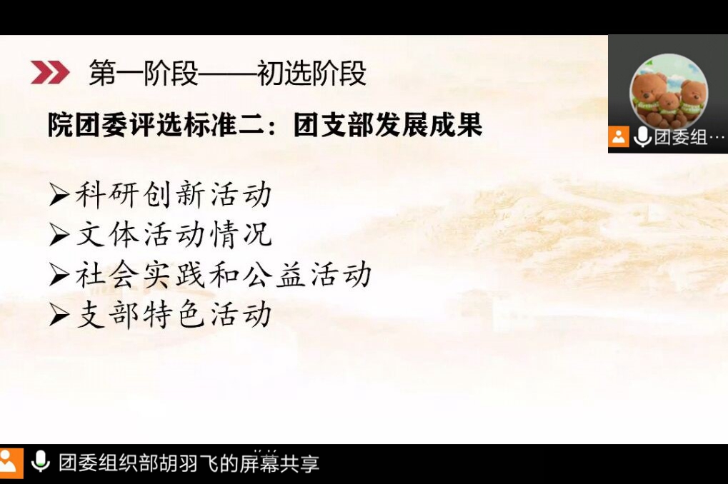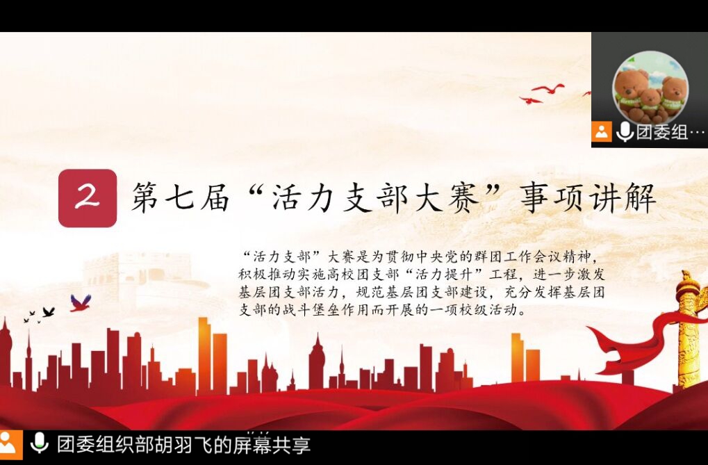 为进一步激发班团支部活力,规范基层团支部建设,8月20日晚,菲律宾欧博游戏官网团委以线上会议的形式举办“我为青年做件事”中期检查情况反馈会暨第七届“活力支部大赛”动员会。团委组织部工作人员张诗语、胡羽飞担任活动主讲人。团委书记时华忠、2019、2020级各班团支部委员会成员参与本次活动。