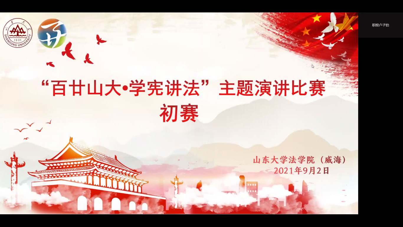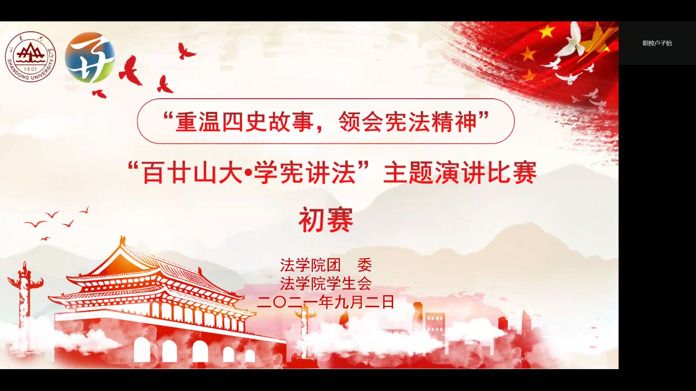 为深入贯彻落实习近平总书记系列讲话精神,进一步落实以宪法为核心的法治教育,弘扬法治精神,9月2日晚,菲律宾欧博游戏官网通过线上会议的方式举办“百廿山大•学宪讲法”主题演讲比赛初赛,辅导员周晓政、孙政、刘泽华、团工委兼职副书记吴睿佳以及第五届全国学生“学宪法·讲宪法”演讲比赛山东赛区一等奖获得者黄嫣然担任本次比赛的评委。