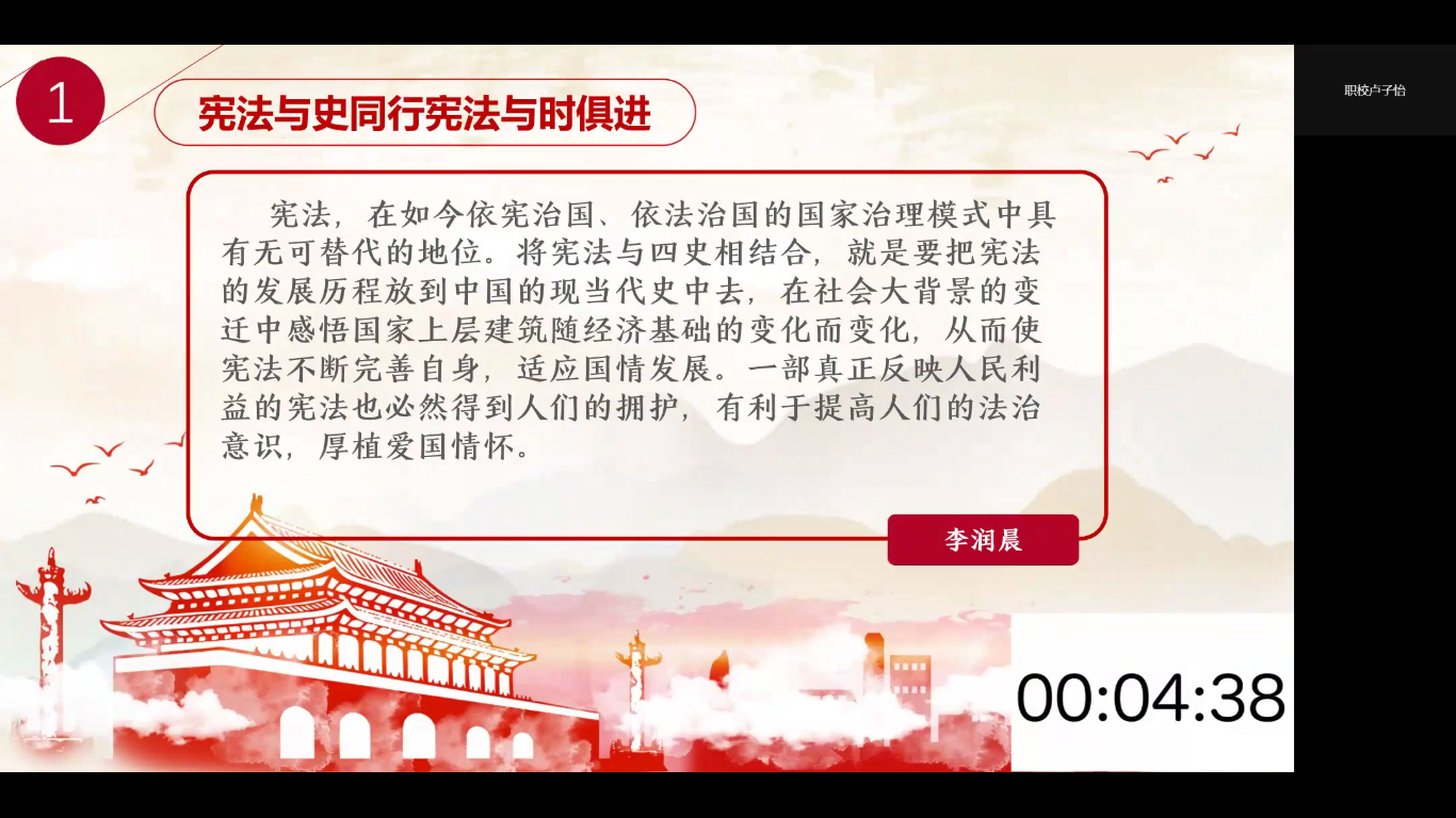 李润晨、田丰歌、胡羽飞、秦源蔓等选手以宪法发展脉络为演讲主线,并依托主线讲述了宪法对于中国的社会发展、国民的生活变化所起到了重大、积极的作用,深入浅出地阐述了宪法的重要性和作用力。选手董佳文将四史故事作为切入点,梳理了宪法精神与四史教育的关系,并呼吁将法治教育与四史教育有机结合,厚植学生们爱国爱党爱社会主义的情感。随后,曾舣灵、吴家仪、郭旭阳三位选手以具体人物事迹为出发点具象化展现宪法精神的价值力。张馨、冯晓迅两位选手从四个维度详细阐述了宪法精神。最后,吴睿佳对本次活动进行点评,从措辞、逻辑、理解力、文体等多个方面提出相关建议。田丰歌、张馨、冯晓迅、胡羽飞、董佳文、秦源蔓、曾舣灵、郭旭阳八位选手进入决赛。