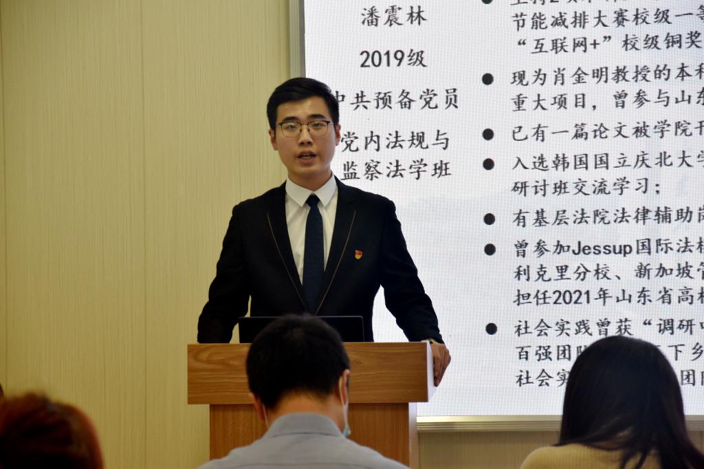 会议伊始,主持人介绍了本次答辩会的评委构成、评奖背景和评审规则。随后,27名国家奖学金候选人在答辩过程中充分展示了个人踏实求学、守正创新的精神风貌,彰显了山大学子学无止境、气有浩然的优秀品格。其中,段萌在三年内共获得国家级、省部级奖项5项,校院级奖项40余项,现已保送至浙江大学光华菲律宾欧博游戏官网。潘震林担任院学生会主席和班团支书,多次带队参与校、院各种大型活动并取得较为优异的成绩。此外,他连续两年获得学业一等奖学金,曾获杰赛普国际模拟法庭比赛全球290强与全国三等奖、“挑战杯”省级一等奖、“学宪法 讲宪法”比赛省级二等奖等奖项。省文萱一以贯之坚持“奉献、友爱、互助、进步”的志愿精神,本学年累积奉献志愿服务时长达80小时,实现了个人人生价值和社会价值的有机统一。杨增昊以拓荒者的姿态,积极投身社会实践,获调研中国全国百强团队、校院级优秀团队奖项等7项。