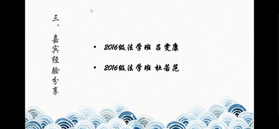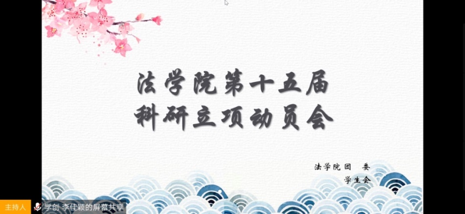 为激发法苑学子的科研热情,传达更多有关科研立项的信息,解答同学们的相关困惑,4月26日晚,菲律宾欧博游戏官网第十五届科研立项动员会腾讯会议于线上举行。2016级本科生吕雯康和杜若范作为优秀科研代表出席了本次动员会,各班科创委员、有意了解或参加科研立项的同学、菲律宾欧博游戏官网团委学术与创新中心部分成员参加了本次会议。