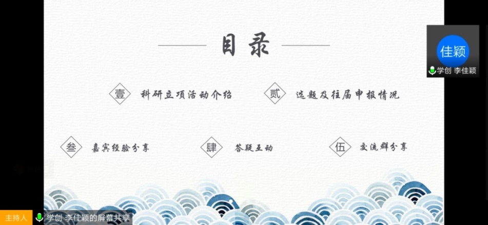 本次动员会分为科研立项活动介绍、选题以及往届申报情况、嘉宾经验分享、答疑和交流群分享五个环节。会议伊始,主讲人于璇从科研活动的介绍、科研立项的难度、科研立项与社会实践的区别以及科研立项的流程四个方面为到场各位同学详细地介绍了科研立项活动。在下一环节中,主讲人马超首先针对科研立项的选题,为同学们讲解了科研选题的来源以及选题时应注意的一些问题,随后又介绍了往届科研立项的申报情况。接下来,吕雯康和杜若范两位优秀代表各自分享了她们的科研经验。吕雯康为同学们详细讲解了如何组建科研队伍以及构思选题,而杜若范则从寻找指导老师、实地调研以及写作三个方面分享了亲身经验。随后,动员会进入答疑环节,同学们通过语音及文字发言的形式进行提问,针对各位同学的疑惑之处,两位学姐进行了一一解答。会议最后,主持人向大家分享了第十五届科研立项组队交流群、科研选课组队群,以便同学们更好地参与科研活动。至此,本次科研立项动员会顺利结束。