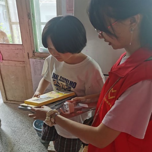 8月8日,团队成员到达稻屯村,在会计张艳红的带领下首先来到了渲渲(化名)家中。团队成员与渲渲共同分享了校园趣事,也为渲渲解答了他在学习与生活中遇到的问题。离开渲渲家后,团队成员前往涵涵(化名)家中进行走访。在与涵涵的交谈中,团队成员了解到,涵涵虽因多种原因就读于职业中等专业学校,但对待学业仍十分认真,始终保持努力奋进的学习态度。对此,团队成员为涵涵送出文具、《中国青年》杂志等礼物,鼓励他潜心学习职业技术,在未来职业生活中一展风采。