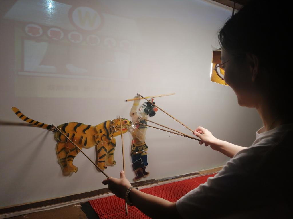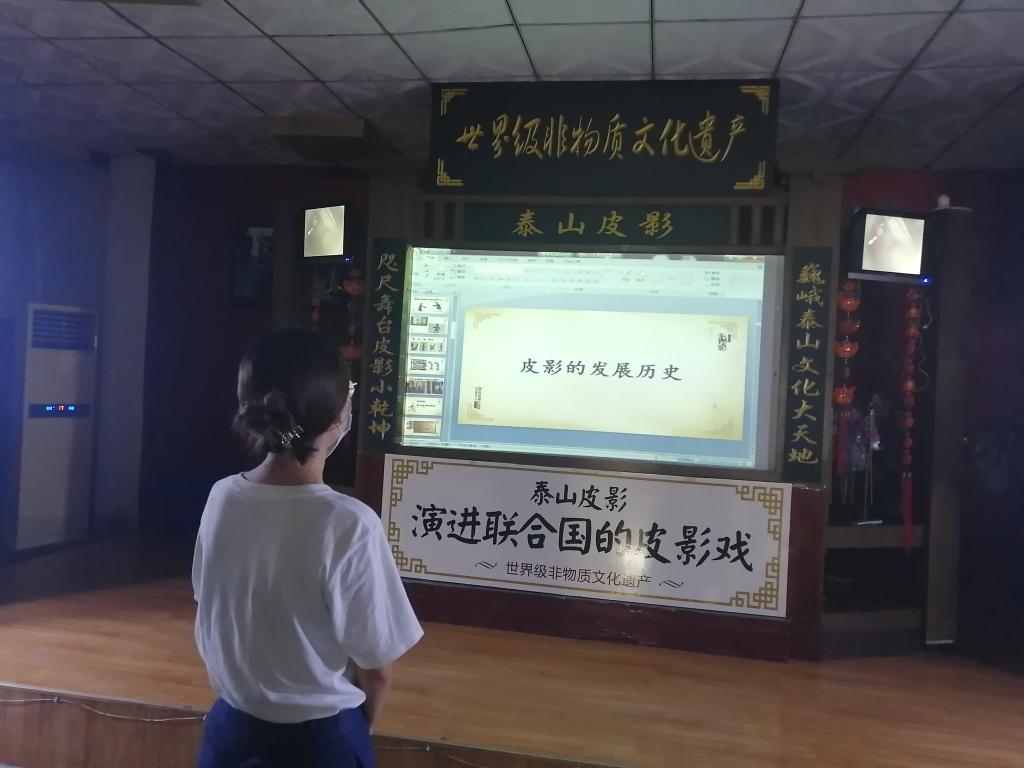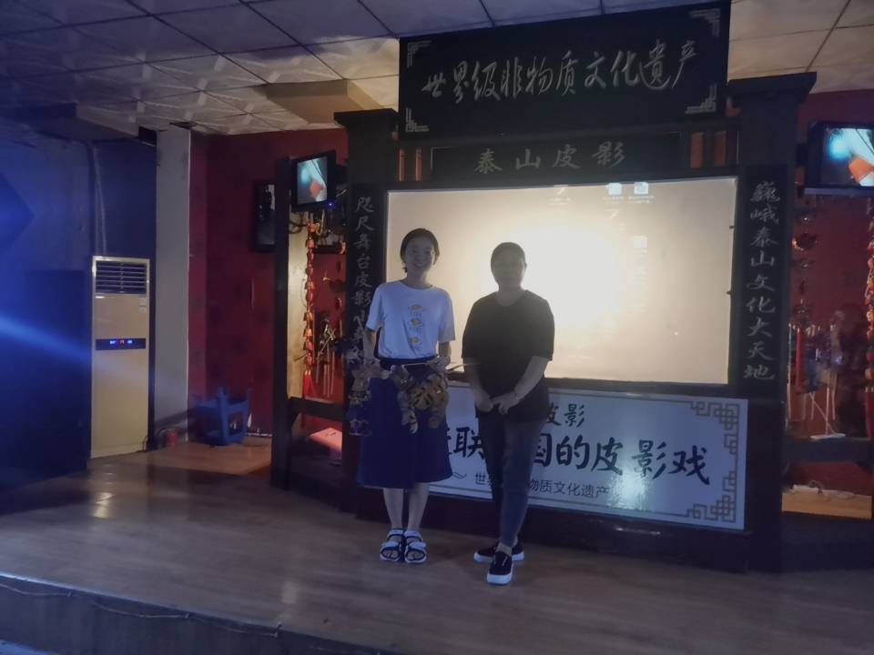 首先,团队成员观看了《泰山石敢当》《蛙鹤龟》等经典名剧以及《江南style》《时间都去哪了》等传统与创新结合的新剧目。其中,演出人员将传统剧本进行改编,融合地方口音和时代热点。演出人员还邀请团队成员走近皮影幕布,讲述皮影复杂精细的制作过程,让团队成员亲身体验皮影演出的魅力。随后,工作人员与团队成员进行交流。通过工作人员的介绍,调研成员了解到,尽管目前泰山皮影戏的保护问题已经受到来自多方的重视,相关文创产业也在不断发展,但目前情况依然不容乐观。很多非遗保护只是存在于政府、非遗传承人等的层面。此外,为了让民众深入了解、体验泰山皮影戏文化,保护中心也一直与政府企业以及学校开展合作,全方位多层次探索更多非遗文化传承和保护方式。