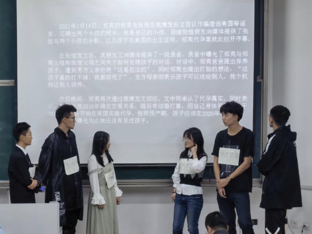 本次活动分为案例展示、小组讨论、自由发言、嘉宾点评和答疑解惑五个环节,案例部分主要围绕两个社会热点事件展开。首先,部分志愿者们通过演绎情景剧的方式,简要还原了“某女明星代孕事件”的经过。随后,同学们围绕“代孕是否应合法化”的问题进行了激烈的自由讨论,并结合生活经验和自身法律知识积极发表看法。在对案例“群众怂恿主播自杀”的分析过程中,部分同学认为主播存在博取流量关注行为,不应追究网民法律责任;部分同学则认为主播死亡与网民怂恿存在因果关系,应当追究网民法律责任。在嘉宾点评环节,张其山老师从利益冲突角度,分析了国家利益与个人生育权的关系;张伟强老师则根据同学观点,运用法经济学的思想进行逻辑分析,以通俗易懂的类比为学生提供思想遵循。在答疑解惑环节,有同学提出“代孕女性是否为自愿”的问题,张伟强老师和张其山老师从概念切入,为学生提供多维思考角度。