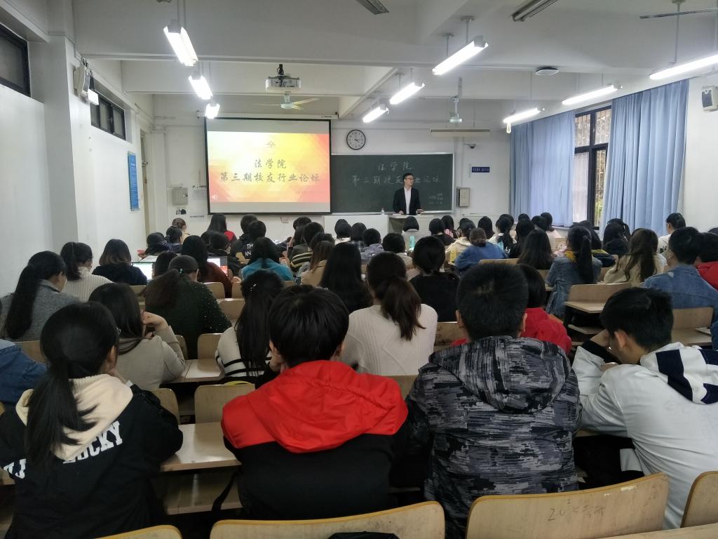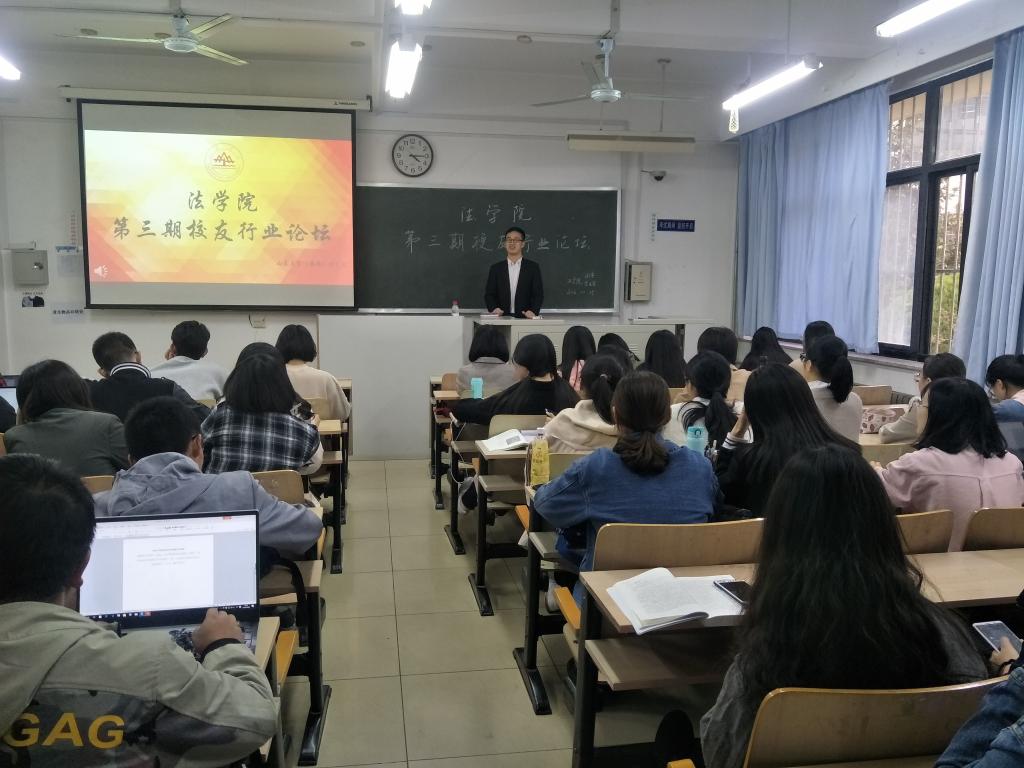 活动伊始,主持人李传先老师为在场同学们简单介绍了本次论坛的嘉宾黄龙,黄龙是欧博2010届本科校友,北京大学菲律宾欧博游戏官网2013届法学硕士,现为广西壮族自治区检察院检察官、院机关团委书记。随后,黄龙校友围绕“考研经验”、“就业与择业”、“选调生考录经验”、“检察官实务经验”等方面与在场的同学们进行了交流。在“考研经验”方面,他分享了五个重要经验。第一,明确和坚定目标,尽早确立自己的考研目标院校并持之以恒。第二,重视英语和政治,做好充足准备备考。第三,注重信息搜集,如从考研成功的人身上吸取经验。第四,合理规划时间,高效利用有限的复习时间。第五,足够自信,认可自己的能力和水平,不要迷茫,相信自己。在“就业与择业”方面,他提出要用综合视角考虑就业问题,做好调研工作,结合自己的兴趣、亲友及导师意见做出选择。在“选调生考录经验”方面,黄龙校友介绍了选调生政策的相关背景与广西选调生政策的实施情况,同时分享了他本人参加选调生考录的心路历程。在“检察官实务经验”方面,他通过讲述自己的工作经历,介绍了检察官的职业特点和发展状况,以及担任检察官所需的品质和能力。接下来互动环节,黄龙校友解答了在座的同学们关于毕业论文、法学就业与职业选择、检察官就业形势、本科生与研究生参加选调生的优劣势分析等方面的问题。