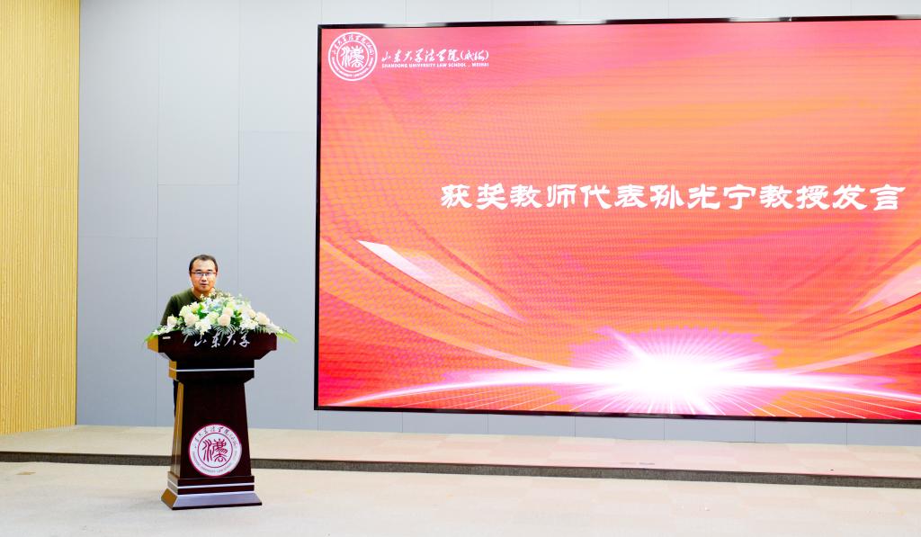山大杰出中青年学者孙光宁教授代表获奖教师发言,他介绍了自己在山大从学生到教师的成长经历,感谢学院对人才的重视,对教学和科研工作的支持。他鼓励教师们积极践行习近平总书记致全国优秀教师代表的信的内容,积极发挥才能,树立“躬耕教坛、强国有我”的志向和抱负,自信自强、踔厉奋发,为强国建设、民族复兴伟业作出新的更大贡献。