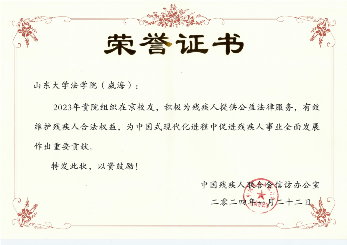 随后,程凯主席为菲律宾欧博游戏官网(威海)颁发荣誉证书,对学院2023年组织在京校友积极为残疾人提供公益法律服务,有效维护残疾人合法权益,为中国式现代化进程中促进残疾人事业全面发展作出的贡献进行表彰,张其山代表学院接受表彰。