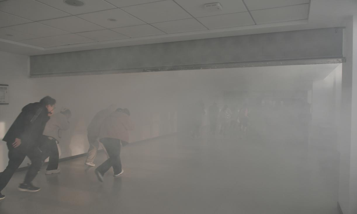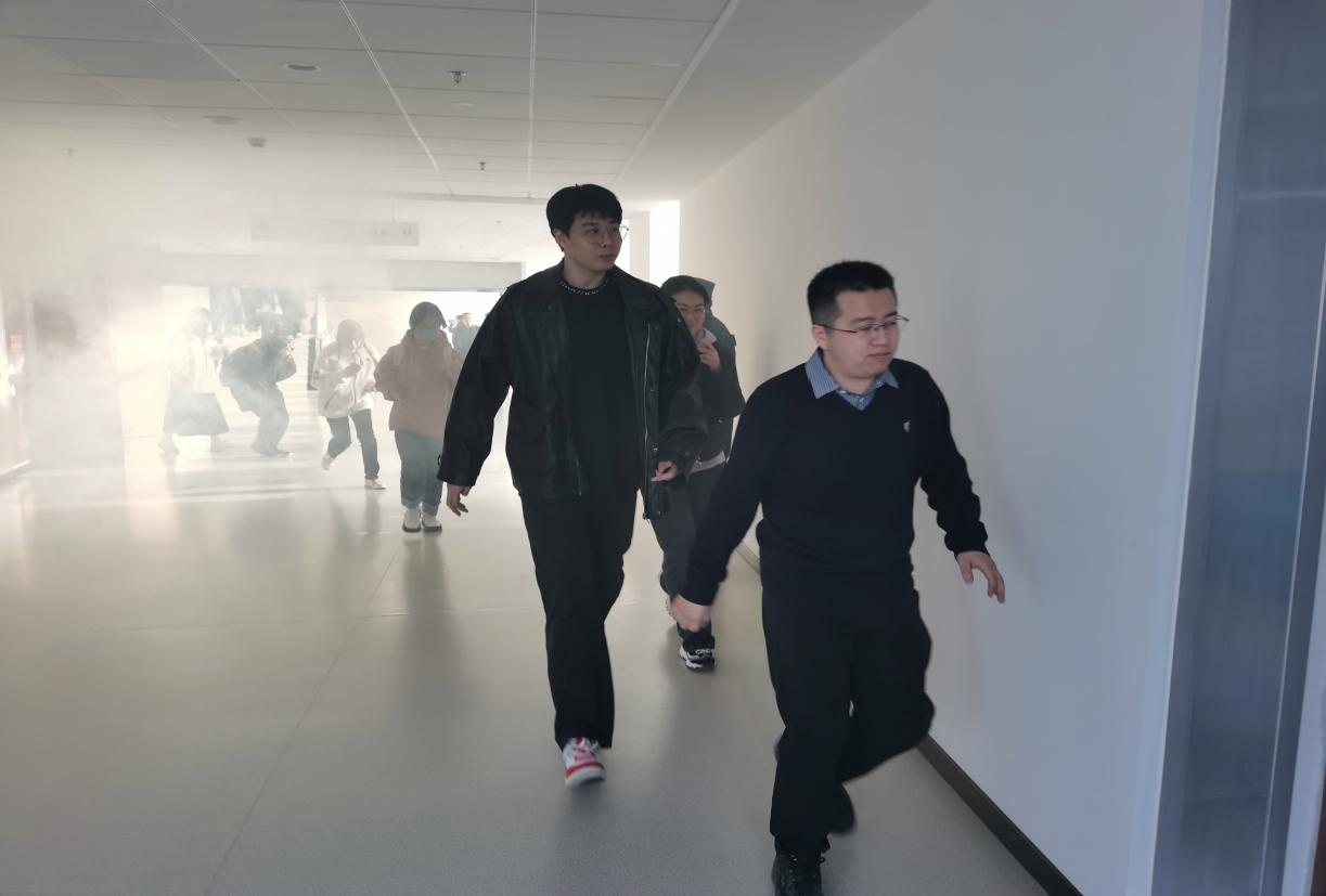 培训结束后,在校区党工委保卫部协助指导下,开展火灾疏散逃生演练。本次演练模拟教学楼内发生火灾,火势迅速蔓延,现场涌出大量浓烟的险情。随着火灾声光警报声响起,应急工作小组成员按照疏散预案迅速做出反应。各小组成员在楼层拐角、安全出口等重要位置有序组织在场师生快速疏散,并引导师生撤离到安全地点。疏散完成,工作人员清点人数并上报,确保无一人遗漏。整个疏散演练过程有条不紊、井然有序,演练达到了预期效果。最后,两学院参加疏散演练工作人员听取专家点评,对应急疏散工作进行复盘分析。