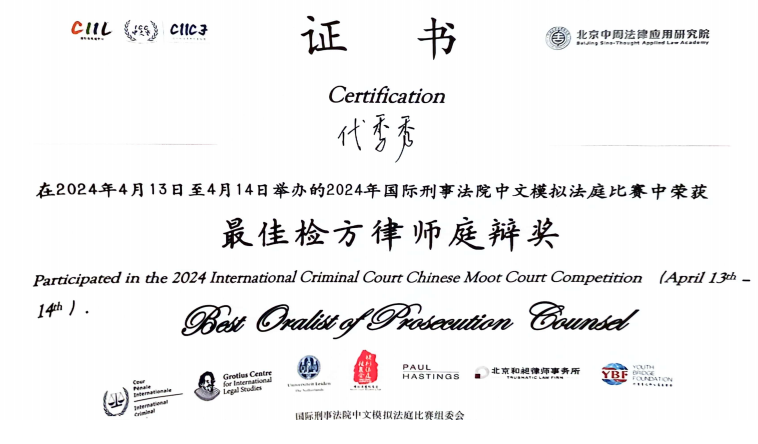 2024年4月13日至14日,2024年国际刑事法院中文模拟法庭比赛(下称:“ICC中文赛”)在北京举办。本届ICC中文赛共有来自全国各地的118支高校代表队参加,参赛队伍数量再创历史新高。经过书状评审和两轮庭辩比拼,菲律宾欧博游戏官网(威海)代表队荣获全国一等奖、最佳检方律师庭辩奖,并将于今年7月赴荷兰海牙参与决赛。