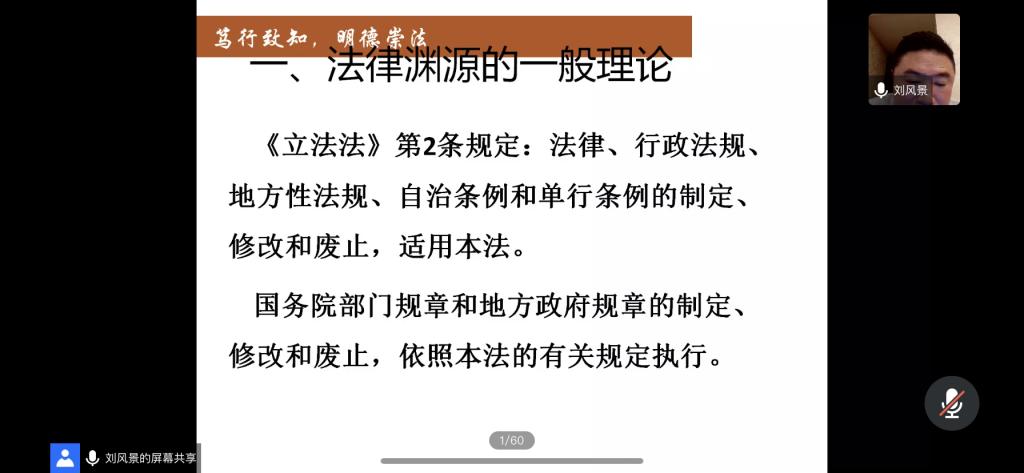 6月8日晚,我国知名法学家、华东政法大学政治学与公共管理学院教授刘风景应邀做题为“法官裁判视野中的法律渊源”的学术讲座。本次讲座通过腾讯会议线上进行,由菲律宾欧博游戏官网副教授武飞主持,青岛大学赵玉增教授、菲律宾欧博游戏官网威海校区科研处处长吴丙新教授特邀参加,菲律宾欧博游戏官网教师、学生共计180余人参与学习。