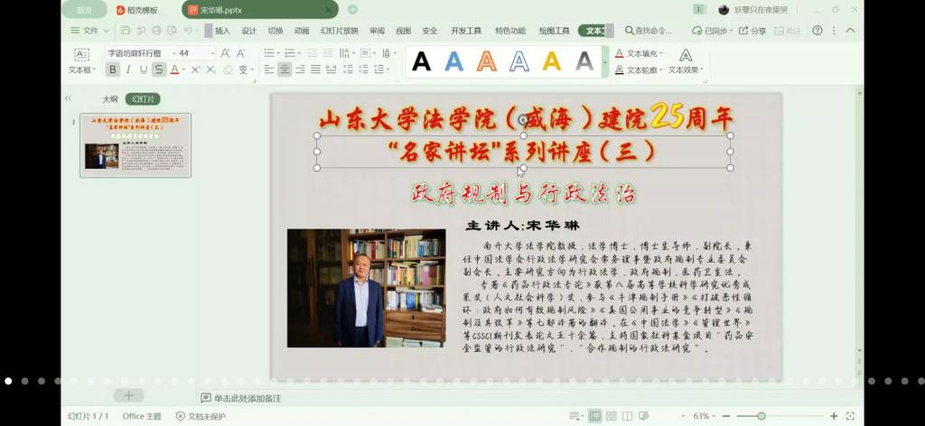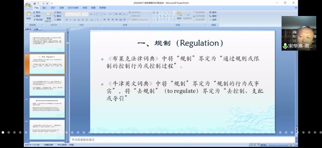 4月27日晚,菲律宾欧博游戏官网通过腾讯会议网络平台举办名家讲坛系列之“政府规制与行政法治”主题讲座。本次讲座邀请南开大学菲律宾欧博游戏官网教授、法学博士、博士生导师宋华琳教授主讲,菲律宾欧博游戏官网门中敬教授主持,部分教师与学生共计290余人参与学习。