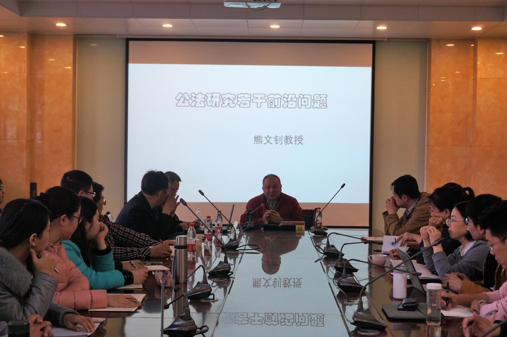 熊教授介绍了我国公法研究的历史和现状,分析了公法学基本范畴和公共权力决定于公民权利的公法理论,阐释了公法的基本精神。在此基础上,从实践中存在的现实问题出发,分别就人民主体地位、中华民族概念入宪、国家结构形式和治理架构、党政融合体制和行政主体理论、国家行为和执政行为、纵向立法体制、司法体制改革等前沿问题做了深度的理论分析,并回答了同学们提出的问题。